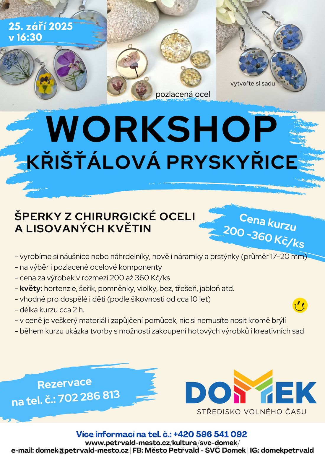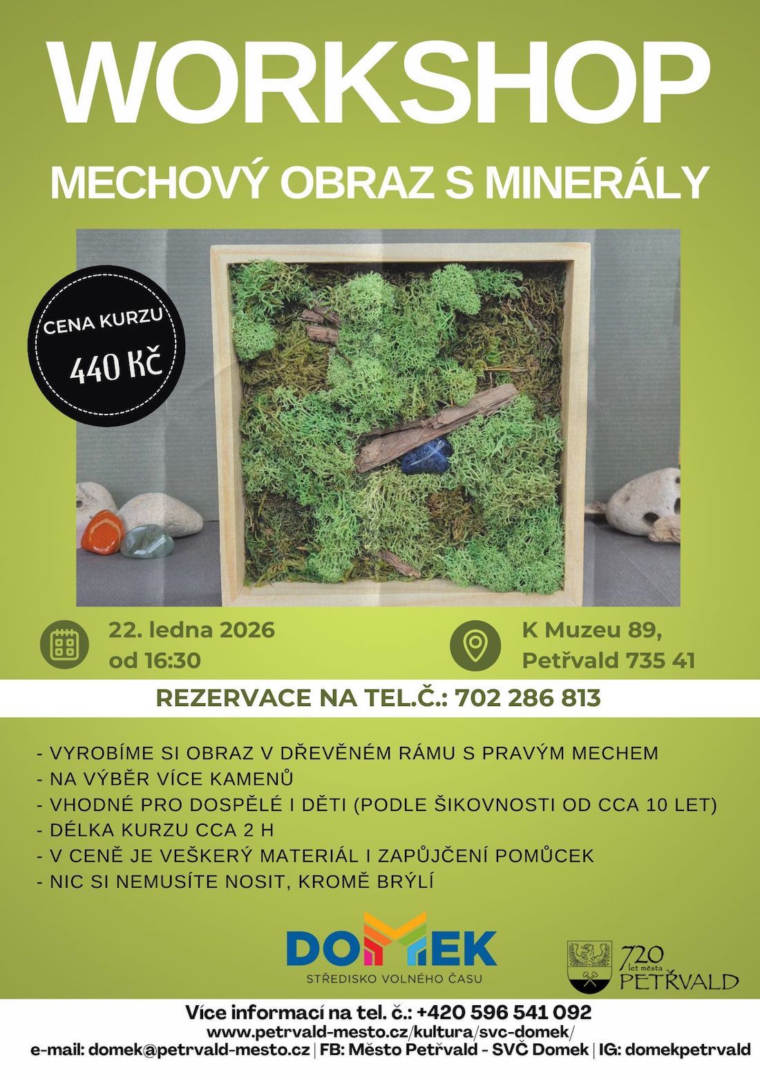 - prosím REZERVUJTE SI MÍSTO na tel. 702 286 813. emailem: domek@petrvald-mesto.cz , případně u mě anebo online zde: