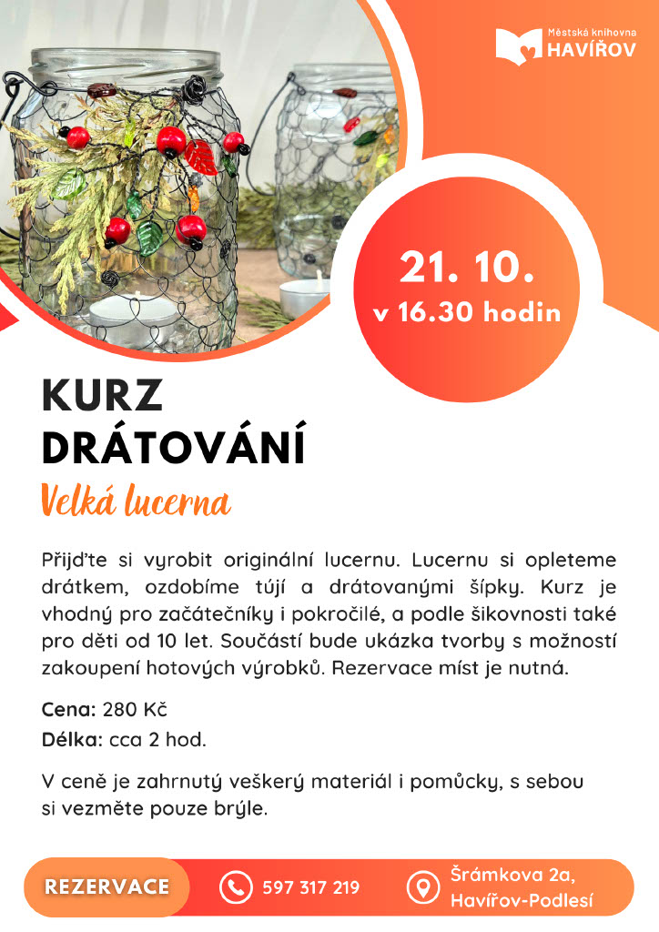- REZERVACE MÍST: přímo v knihovně, e-mailem: klub@knih-havirov.cz či telefonicky: 597 317 221