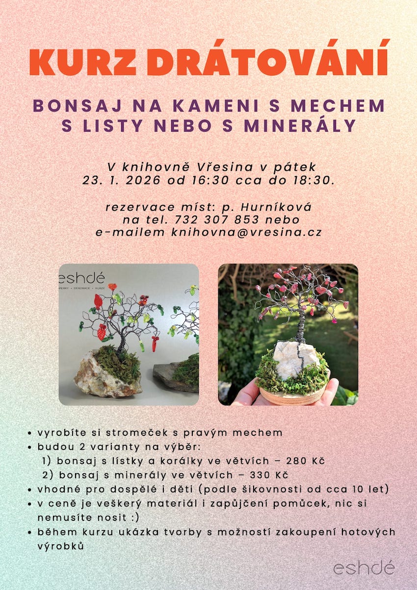 - místo konání: Obecní knihovna VŘESINA - Osvobození 294, 742 85 Vřesina